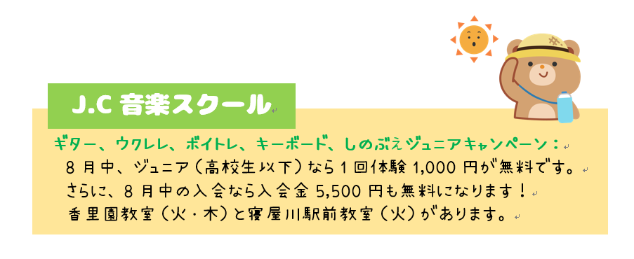 J.C音楽スクールの8月キャンペーンのお知らせです!今月は久しぶりのジュニアキャンペーンです。